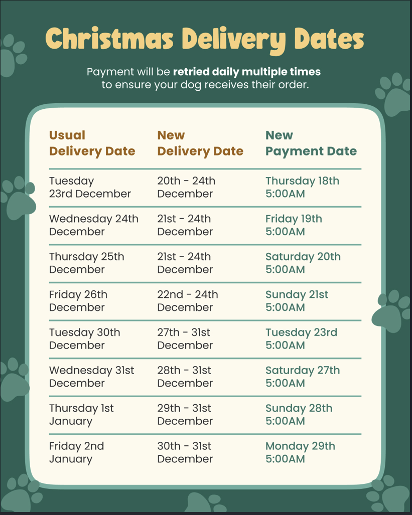 🚚 This helps us stay ahead of any potential courier delays and ensures your dog(s) doesn't run short of Years during the busy holiday season.