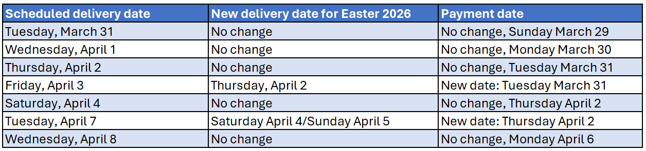 To keep things running smoothly, some deliveries will arrive a little earlier than usual. Here's a quick overview: