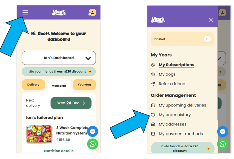 On a mobile, first select the three horizontal lines at the top left, and then select Purchase History