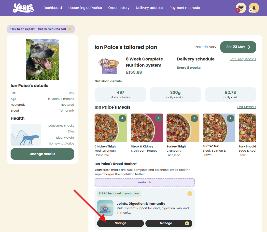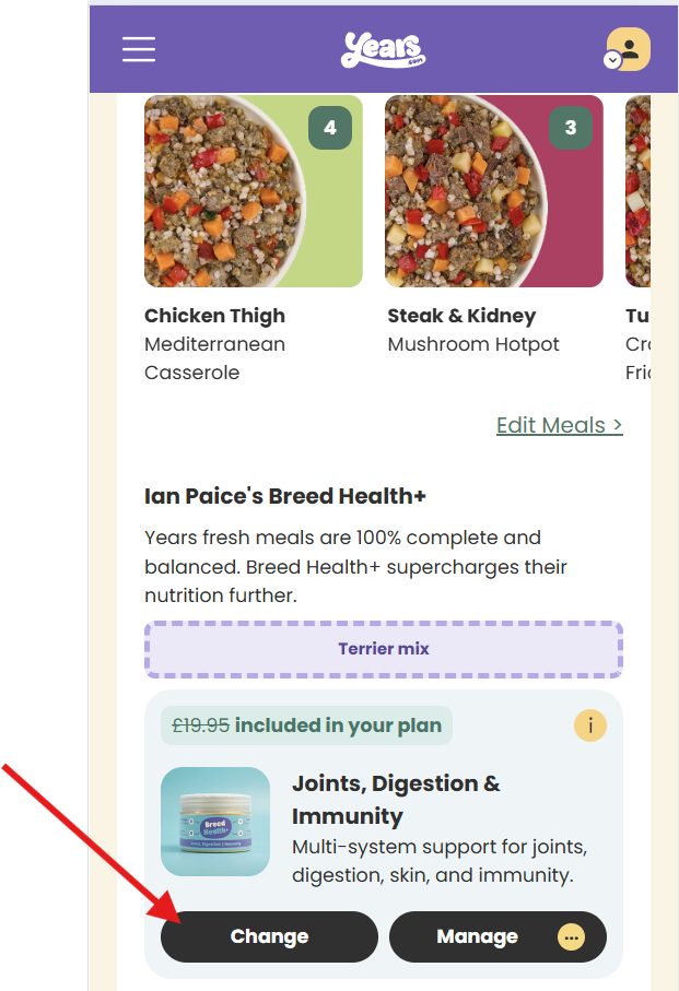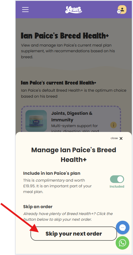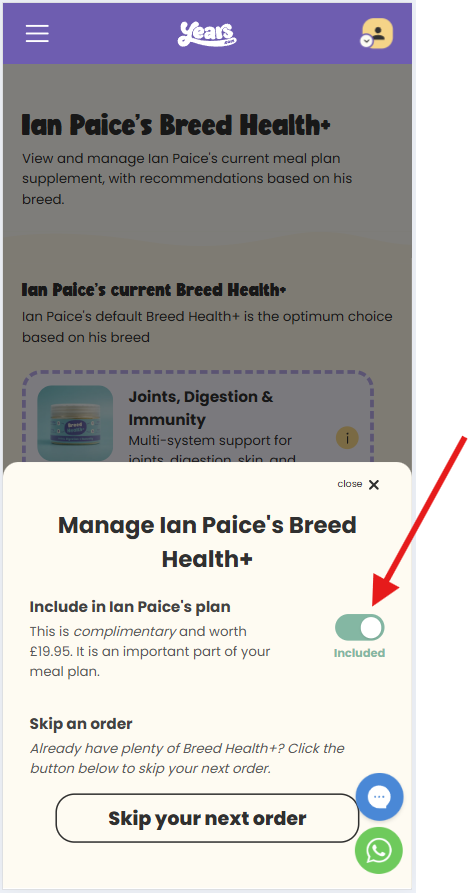 Great news — you're in full control! Managing your pup's Breed Health+ supplement is quick and simple, all from your dog's dashboard.