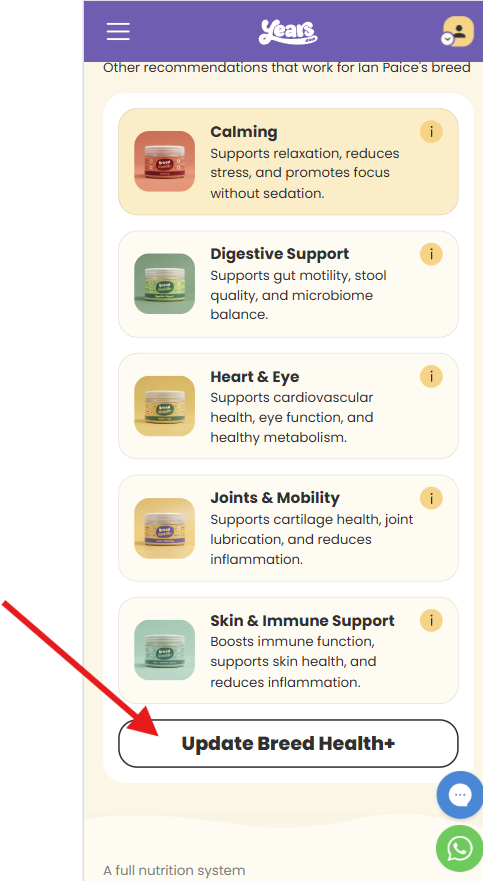 - 📋 Scroll to the Breed Health+ section, just beneath your dog's recipe selection